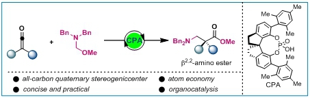 孫江濤團(tuán)隊發(fā)展了一種以烯酮和N,O-縮醛為原料,在手性磷酸催化下實現(xiàn)了烯酮的不對稱胺甲基化,從而簡潔、高效、綠色合成光學(xué)純的β2,2-氨基酸的新方法。