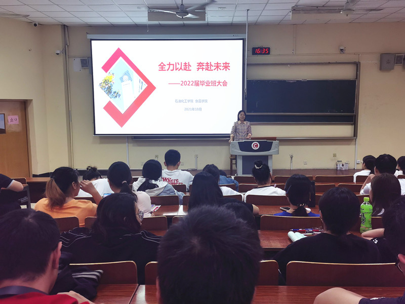 10月14日下午,石油化工學(xué)院食品學(xué)院畢業(yè)班大會在W5階召開。出席本次大會的有院黨委副書記宣慧、副院長黃海、各專業(yè)輔導(dǎo)員。2022屆全體畢業(yè)生參加此次大會,會議由學(xué)工辦主任方俊主持。