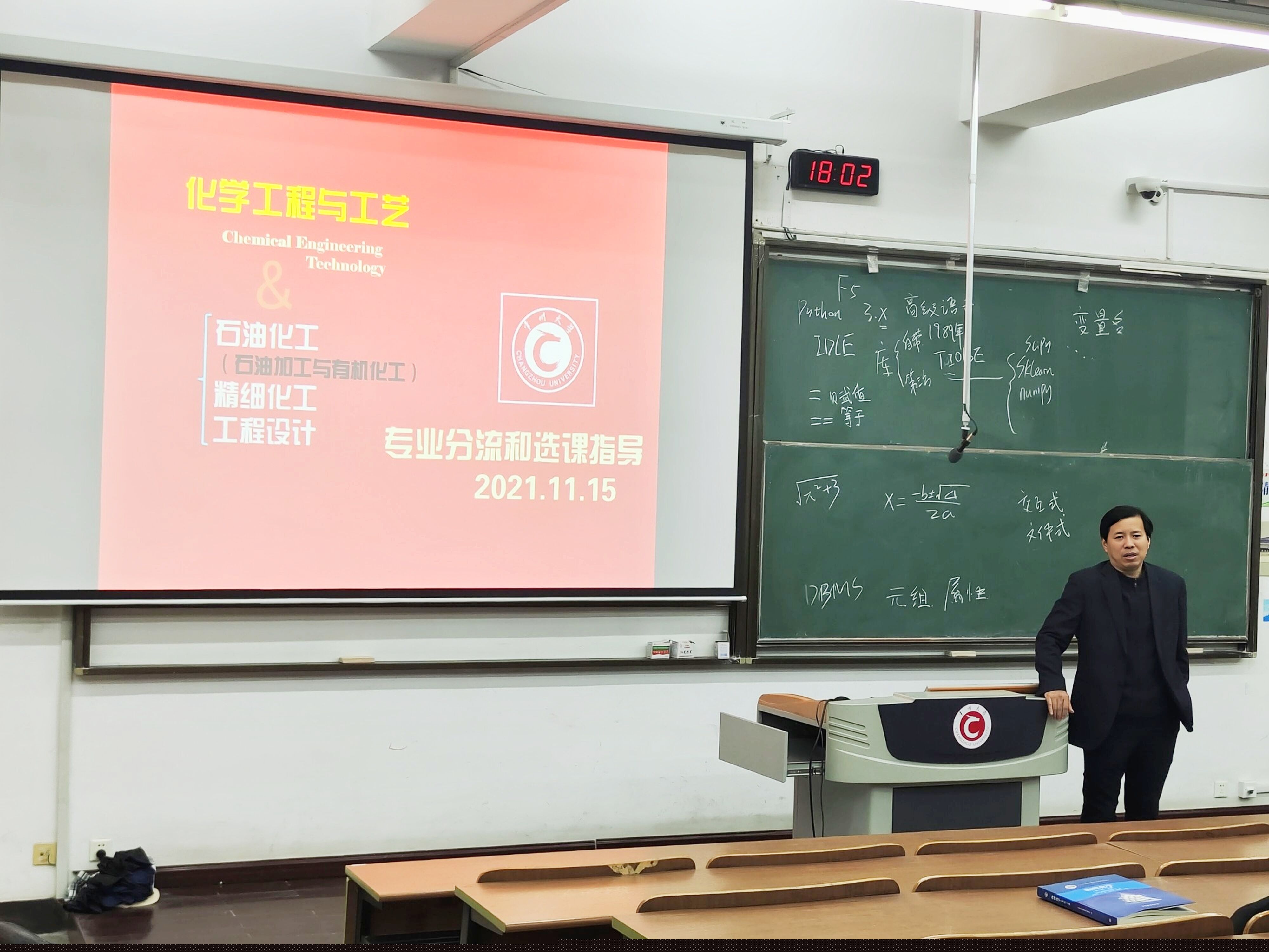 會上,馬江權(quán)就化工專業(yè)的選課、專業(yè)分流、考研、就業(yè)及相關(guān)專業(yè)競賽活動等多方面與同學(xué)們進行了交流指導(dǎo)。他詳細講解專業(yè)學(xué)習(xí)的方法及專業(yè)分流后的注意事項,介紹往年每屆學(xué)生的分流情況,要求大家加強專業(yè)學(xué)習(xí),及早做好就業(yè)與考研準(zhǔn)備。