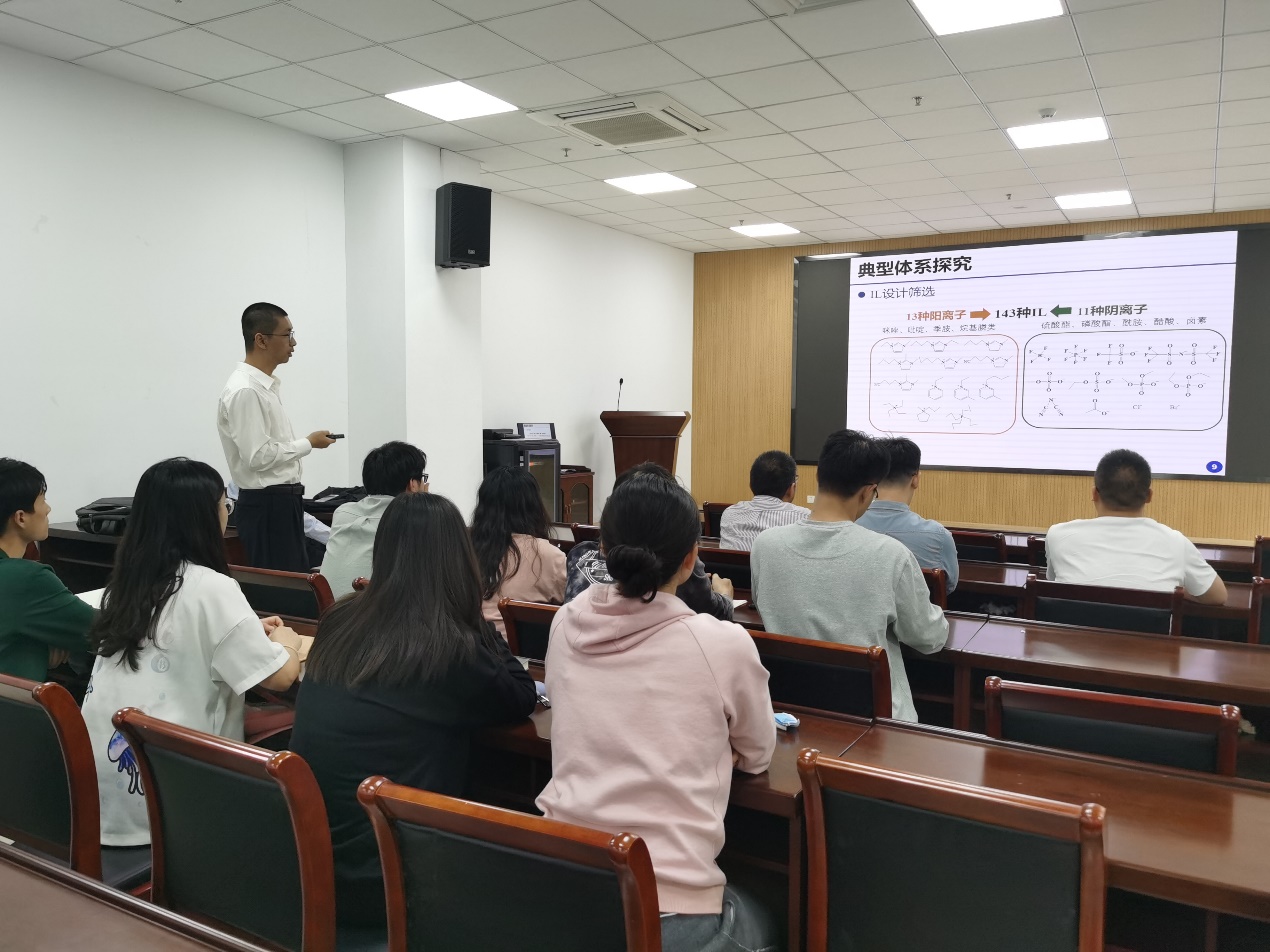 戚律老師作了“過(guò)程強(qiáng)化視角下典型化工分離體系探究”的報(bào)告,他于2021年4月-2022年3月在上海交通大學(xué)羅正鴻教授聚合反應(yīng)工程實(shí)驗(yàn)室訪學(xué),報(bào)告會(huì)上,戚老師介紹了他近幾年在化工分離領(lǐng)域基于離子液體所做的多尺度過(guò)程強(qiáng)化研究,和大家探討了化工學(xué)科做研究的心得體會(huì)。