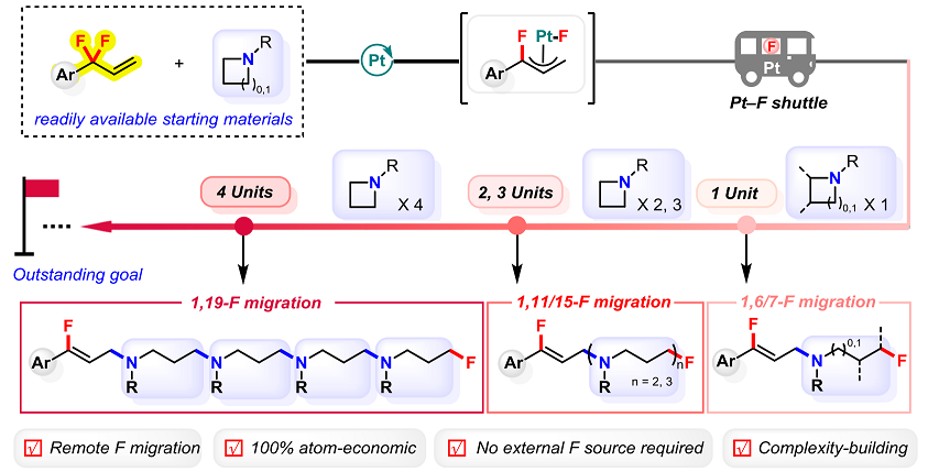 近期,常州大學陳銘教授團隊發(fā)展了一種全新的鉑催化策略,利用簡單易得的偕二氟亞甲基烯烴作為含氟前體,通過模塊化的多單元插入反應,首次實現(xiàn)了超遠程氟遷移,成功構(gòu)建出一系列1,6-、1,7-、1,11-、1,15-乃至1,19-二氟化合物。這項研究將氟原子的遷移距離前所未有地拓展至19個化學鍵,開辟了C–F鍵重構(gòu)與空間編輯的新路徑。