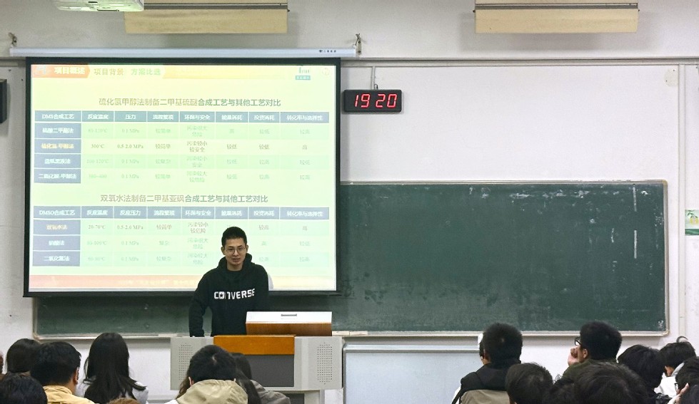 為幫助同學(xué)們拓寬專業(yè)視野、提升專業(yè)實(shí)踐能力,11月11日晚,“石化青年說”系列講座第二講在W1207教室順利舉行,講座由化工224班常佩源與化工226班張皓博兩位同學(xué)擔(dān)任主講。他們所在的常州大學(xué)“砜硫隊(duì)”,曾憑借“福建凱美特氣體有限公司分公司年產(chǎn)1.5萬噸二甲基亞砜項(xiàng)目”的出色設(shè)計,在2025年“天正設(shè)計杯”第十九屆全國大學(xué)生化工設(shè)計競賽中脫穎而出,斬獲全國特等獎。