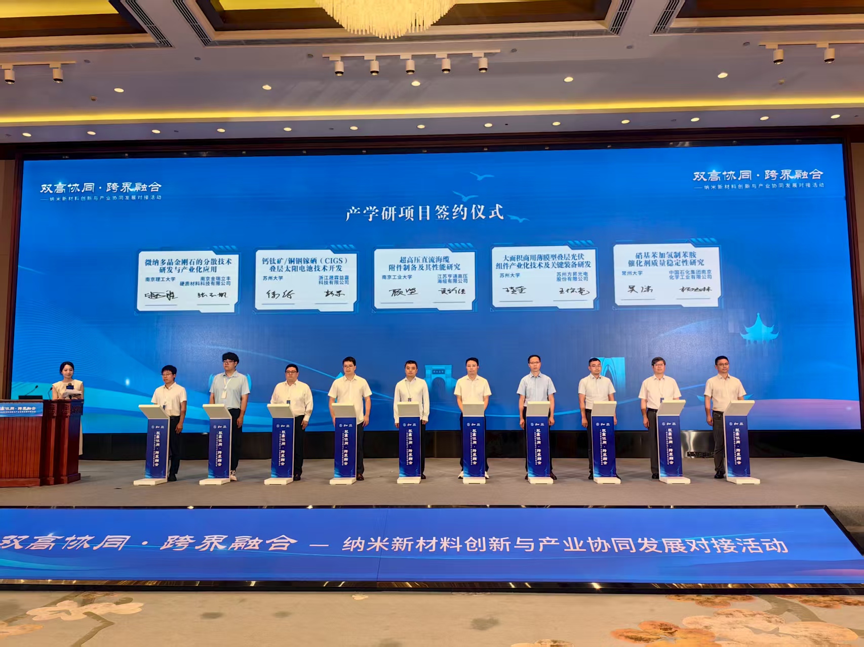 蘇州納米科技協(xié)同創(chuàng)新中心與全國高校先進(jìn)材料區(qū)域技術(shù)轉(zhuǎn)移轉(zhuǎn)化中心(江蘇)簽署合作協(xié)議,中國藥科大學(xué)等6所高校協(xié)同創(chuàng)新中心與全國高校生物醫(yī)藥區(qū)域技術(shù)轉(zhuǎn)移轉(zhuǎn)化中心(江蘇蘇州)達(dá)成共建共識,10個(gè)校企合作項(xiàng)目同步簽約,其中我校光伏科學(xué)與工程協(xié)同創(chuàng)新中心、先進(jìn)催化與綠色制造協(xié)同創(chuàng)新中心分別與江蘇晶盛旺新材料科技有限公司、中石化南京化工研究院有限公司簽約合作項(xiàng)目。常州大學(xué)等江蘇高校納米新材料領(lǐng)域多項(xiàng)重大科技成果同步發(fā)布,涵蓋光伏、生物醫(yī)藥、環(huán)境治理、半導(dǎo)體材料等關(guān)鍵領(lǐng)域。 |