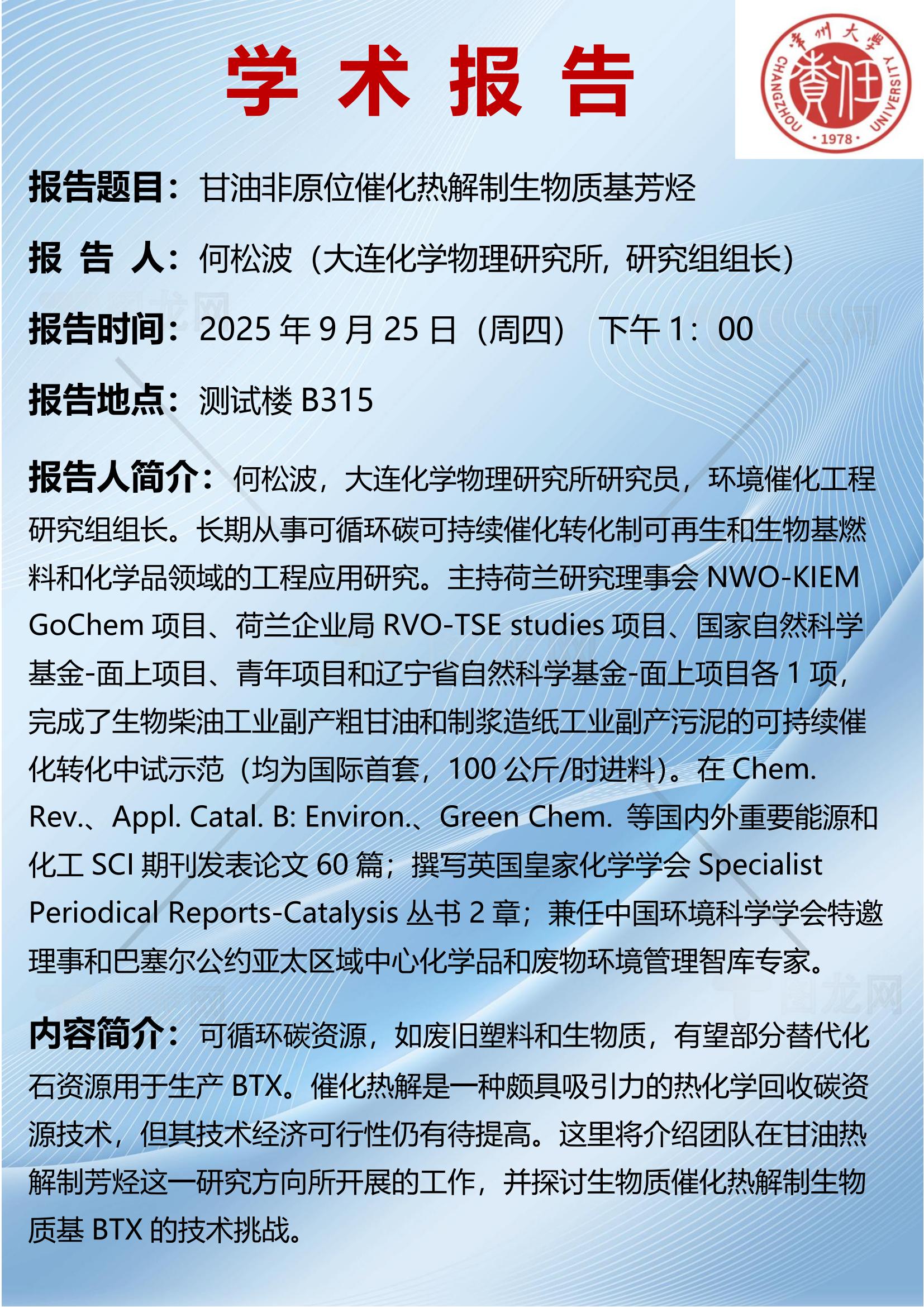 【學術報告】9月25日甘油非原位催化熱解制生物質基芳烴